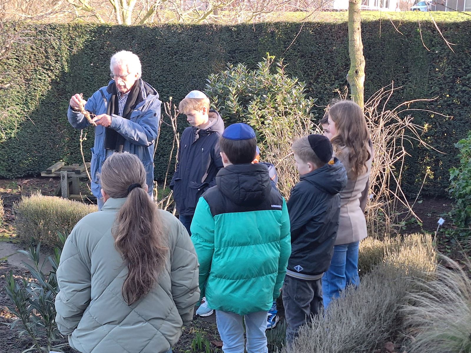 Zondagochtend 8 februari bezocht de Avondmaalscatechesegroep met hun ouders de Dijksynagoge. Het doel was om kennis te nemen van de Joodse rituelen rondom Pesach. In de tuin kreeg de groep een rondleiding van tuinman Johan Crezee. Hij legde o.a. uit wat de betekenis is van het gebruik van Mierikswortel (bitter kruid): Door het eten van Mierikswortel schieten de tranen in je ogen, hetgeen herinnert aan het verdriet van de onderdrukking van het volk Israël in Egypte ten tijde van Mozes. Binnen in de "sjoel" (= synagoge) legde Ronald Kitsz allerlei gebruiken rondom Joodse vieringen uit. Zo bleek bv. hoeveel woorden in ons dagelijks taalgebruik afkomstig zijn uit de Joodse taal (Hebreeuws) ![]() ![]()
